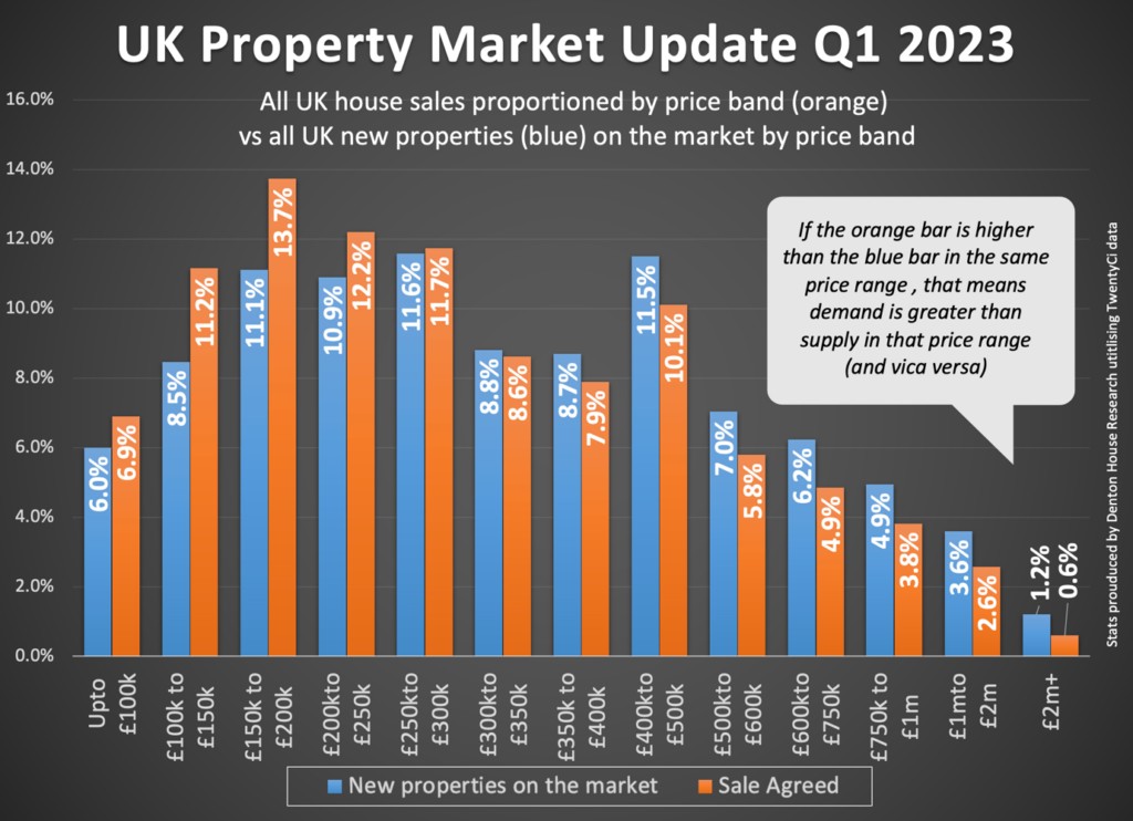 Nearly half (44%) of all the properties sold in the UK in Q1 ’23 were £250,000 or less, yet only just over a third of the homes (36%) that came on the market in the UK in Q1 ’23 were £250,000 or less.